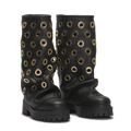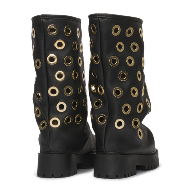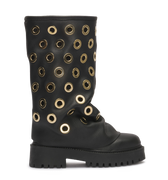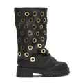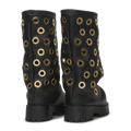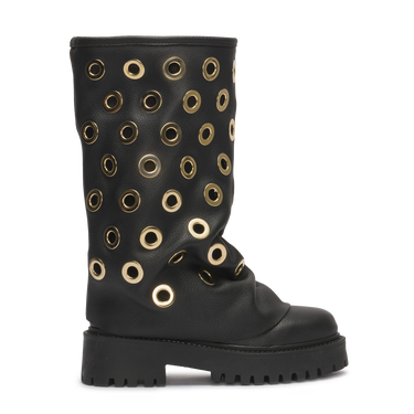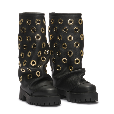 The CHUNKY – Black Gold Giant Eyelets Edition redefines the CR03 aesthetic through a bold play of texture and metal. Crafted in soft black leather and enhanced with oversized golden eyelets, it delivers a sculptural, rebellious identity. A chunky lug sole adds grip, strength and unmistakable style.