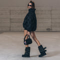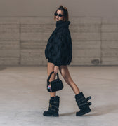 The elegant Black Glacier serves as a versatile base, while the Knotty bag adds structural interest and dimension.