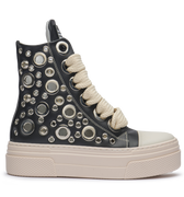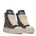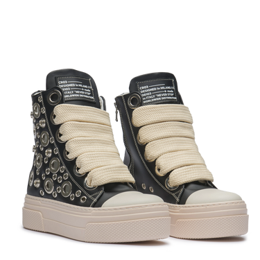 CALIPSO BLACK CHROME combina pelle nera con dettagli silver a contrasto e lacci in cotone color crema. Un design pensato per dominare la scena urbana con forza e stile, esaltando l’attitudine luxury street di CR03.