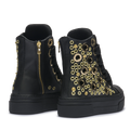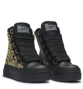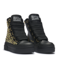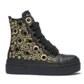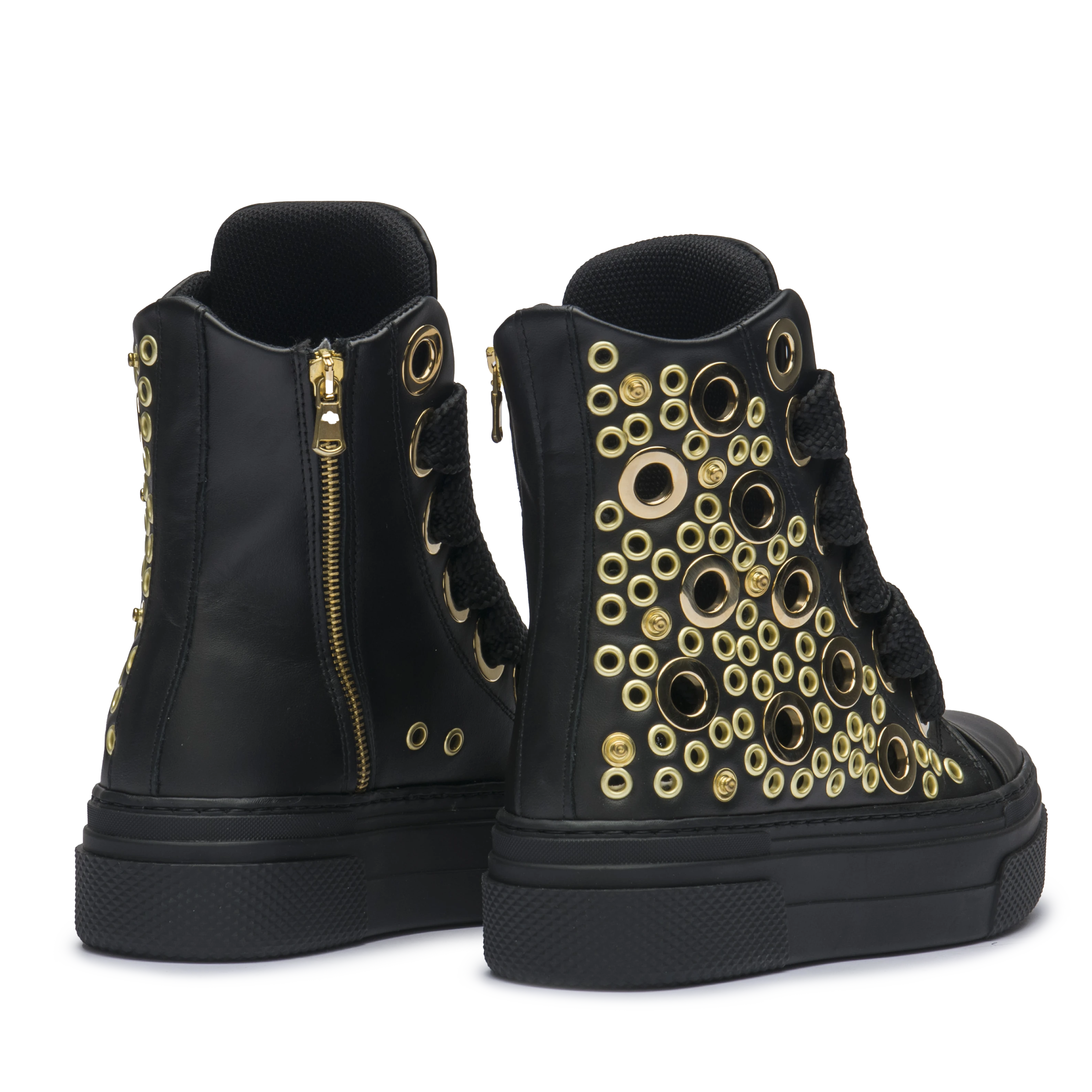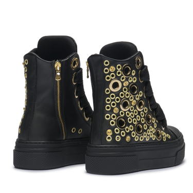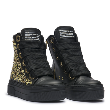 CALIPSO HEAVY METAL reinventa la sneaker high-top con un’anima audace: pelle nera, maxi occhielli dorati e lacci extra-wide intrecciati. Un contrasto di forza e design, pensato per dominare la scena con attitudine rock e dettagli luxury Made in Italy.