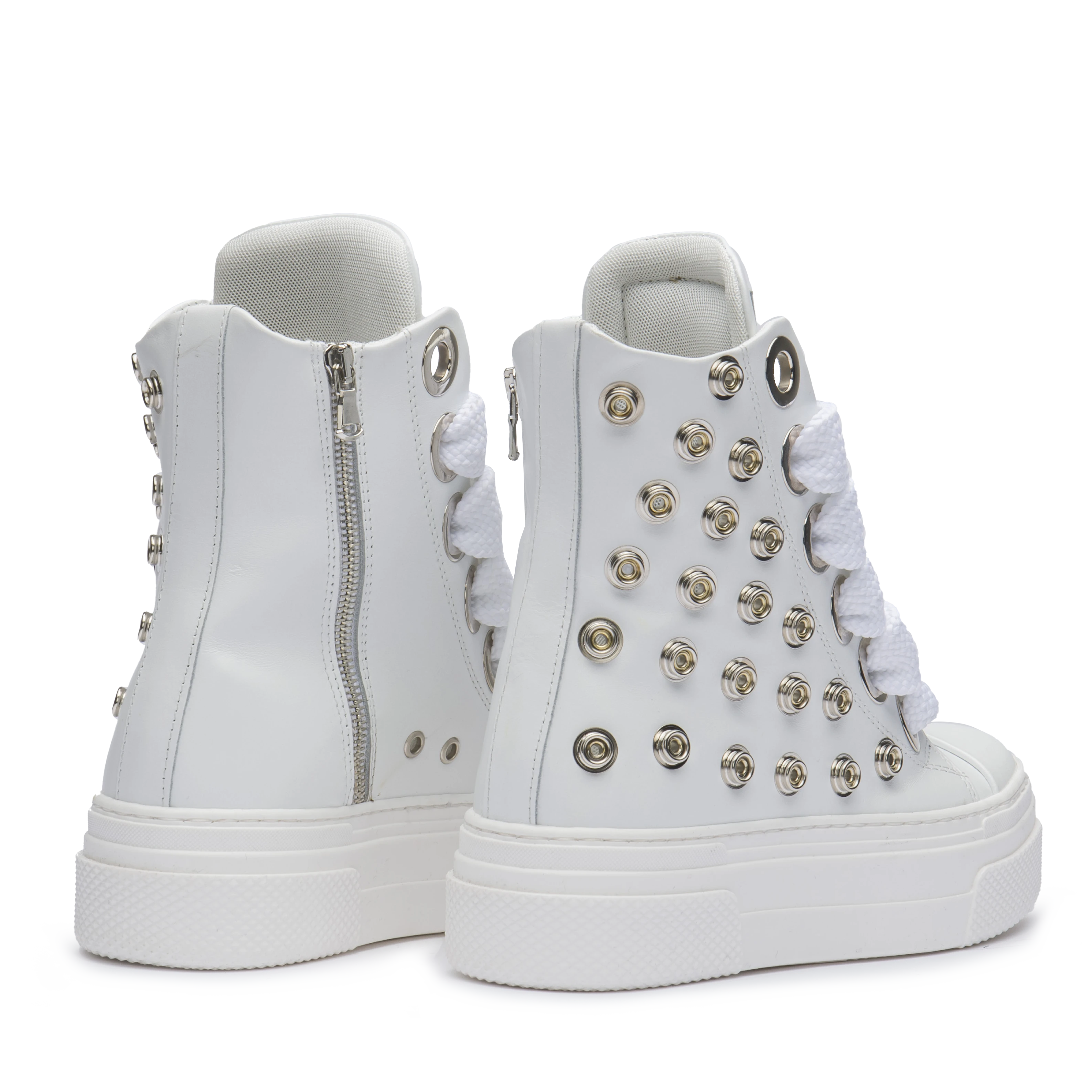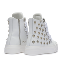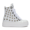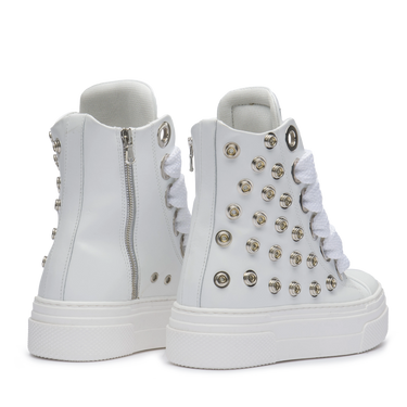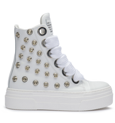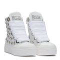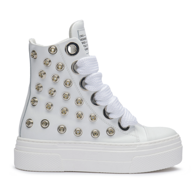 CALIPSO WHITE METAL unisce linee pulite e dettagli metallici per un’estetica bold e raffinata. La pelle bianca contrasta con i maxi occhielli silver e i lacci oversize in cotone, creando una sneaker dal carattere deciso e dallo stile inconfondibilmente CR03.