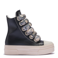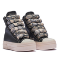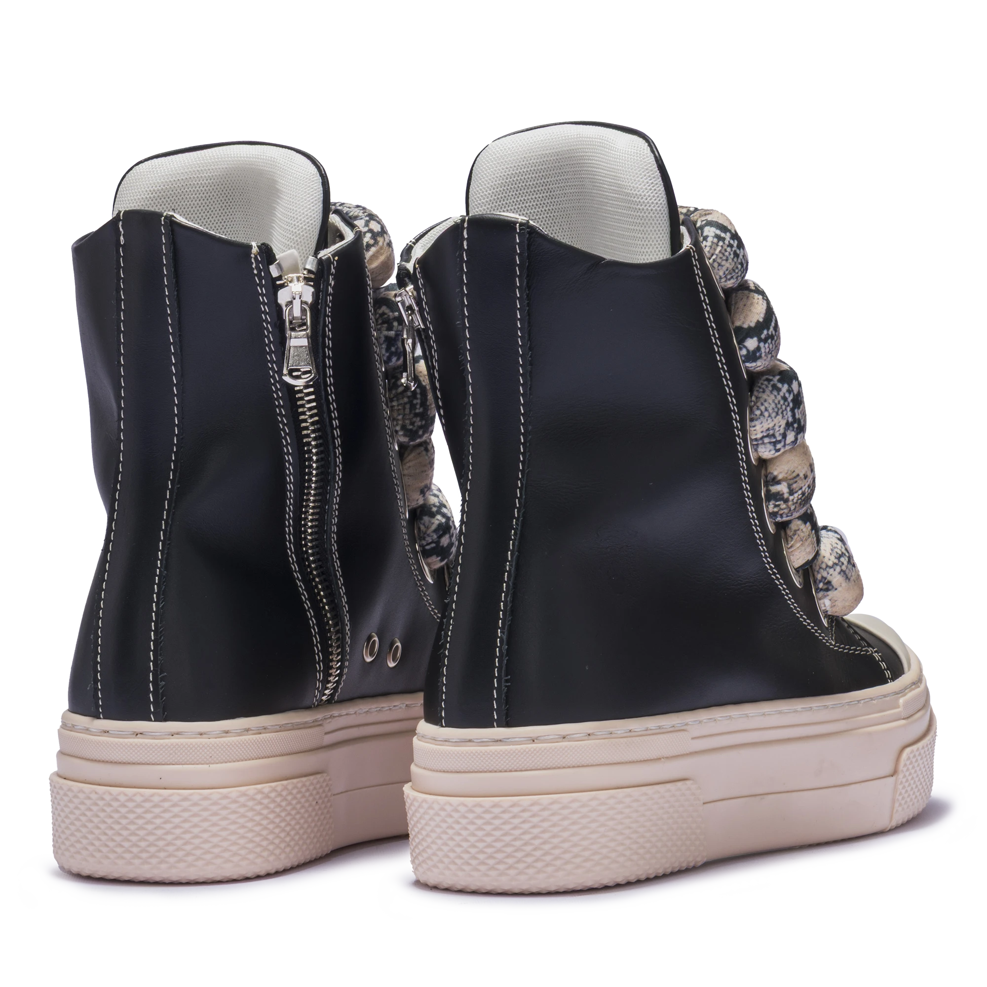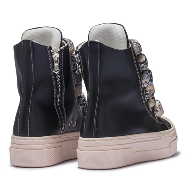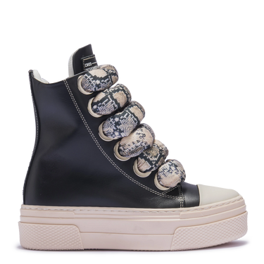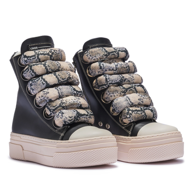 The CALIPSO – Python Laces Edition transforms the signature CR03 silhouette into a piece of art. The oversized printed laces with a soft python effect contrast with the matte black leather upper and cream platform sole. A fusion of power and style — handcrafted in Italy for those who dare to stand out.