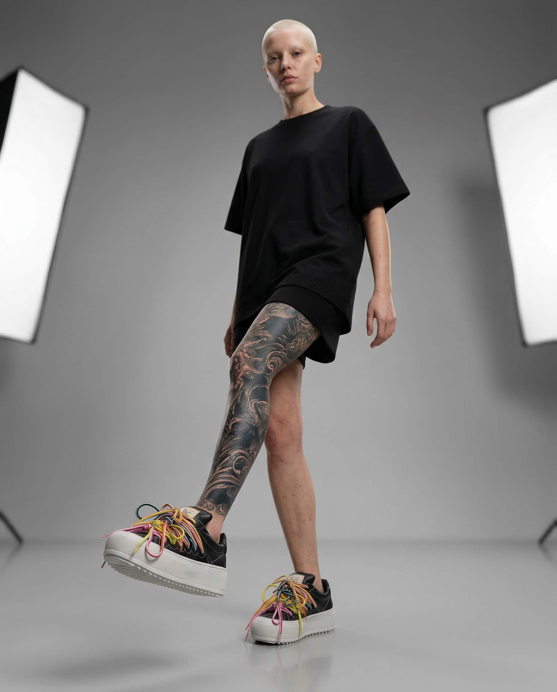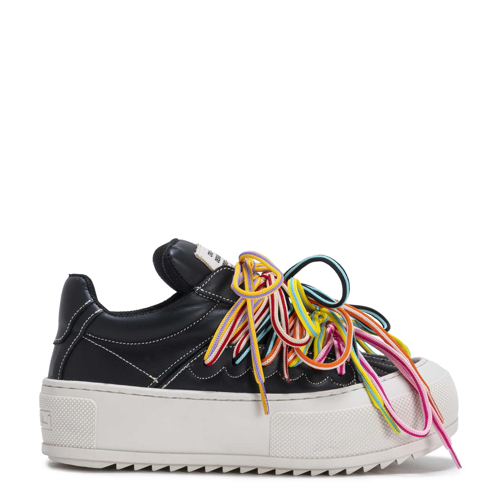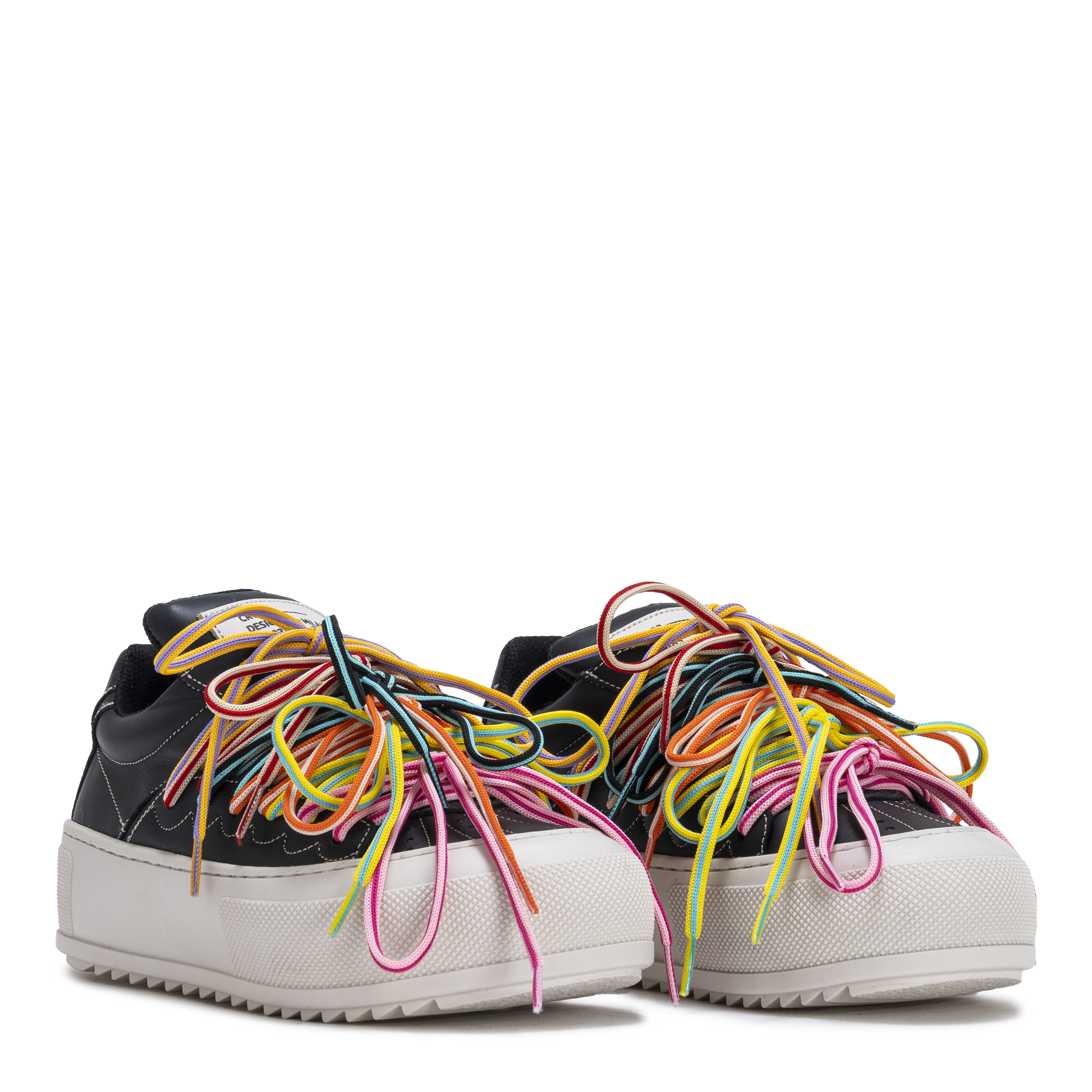 Crafted in smooth black leather, CHAOS NIGHT balances bold multicolor layered laces with a clean architectural platform sole. The contrast between structured base and visual movement creates a confident, urban statement.