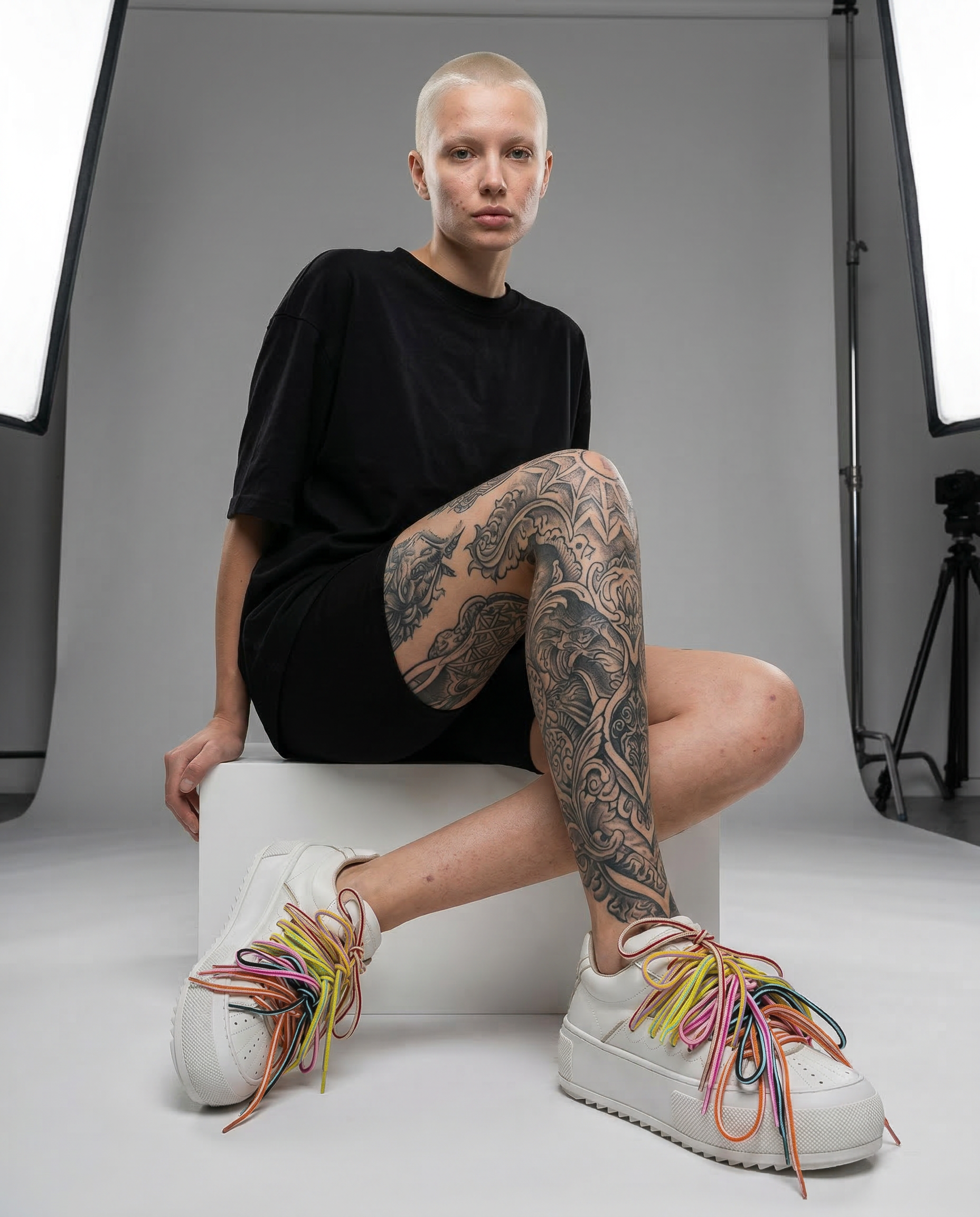 Crafted in smooth white leather, CHAOS keeps the silhouette minimal while the upper is overtaken by layered multicolor laces that create movement, volume, and visual tension. The structured platform sole grounds the design, balancing energy with stability.
