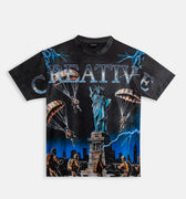 The Creative Liberty Tee features an all-over sublimated print depicting the Statue of Liberty, paratroopers, and electric lightning — symbols of strength and revolution.